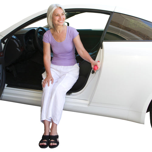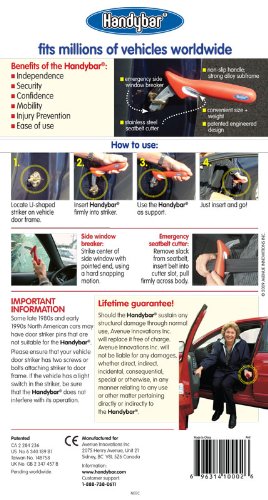 The Handy Bar makes it easy to get in-and-out of the car. Simply slide the handle into the striker/door-latch for extra support while sitting or standing. It fits any door striker - so you can have support anywhere in the car for stress-free traveling. When you are done, simply place the handle in your car and you're ready to go. It also comes equipped with a window breaker and seat belt cutter to keep you safe during emergencies. 350 lbs weight capacity.