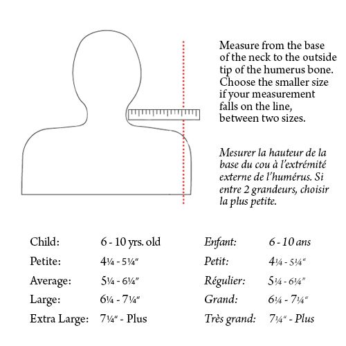 Measurement is to use a shoulder measurement to determine size. Measure from the base of the neck to the outside tip of the humerus bone. Please see above measurement image.
