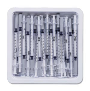 Trays with permanently attached PrecisionGlide™ needles. Allergist Tray, 1mL, Permanently Attached Needle, 27G x ½", Regular Bevel, 25/tray, 40 trays/cs