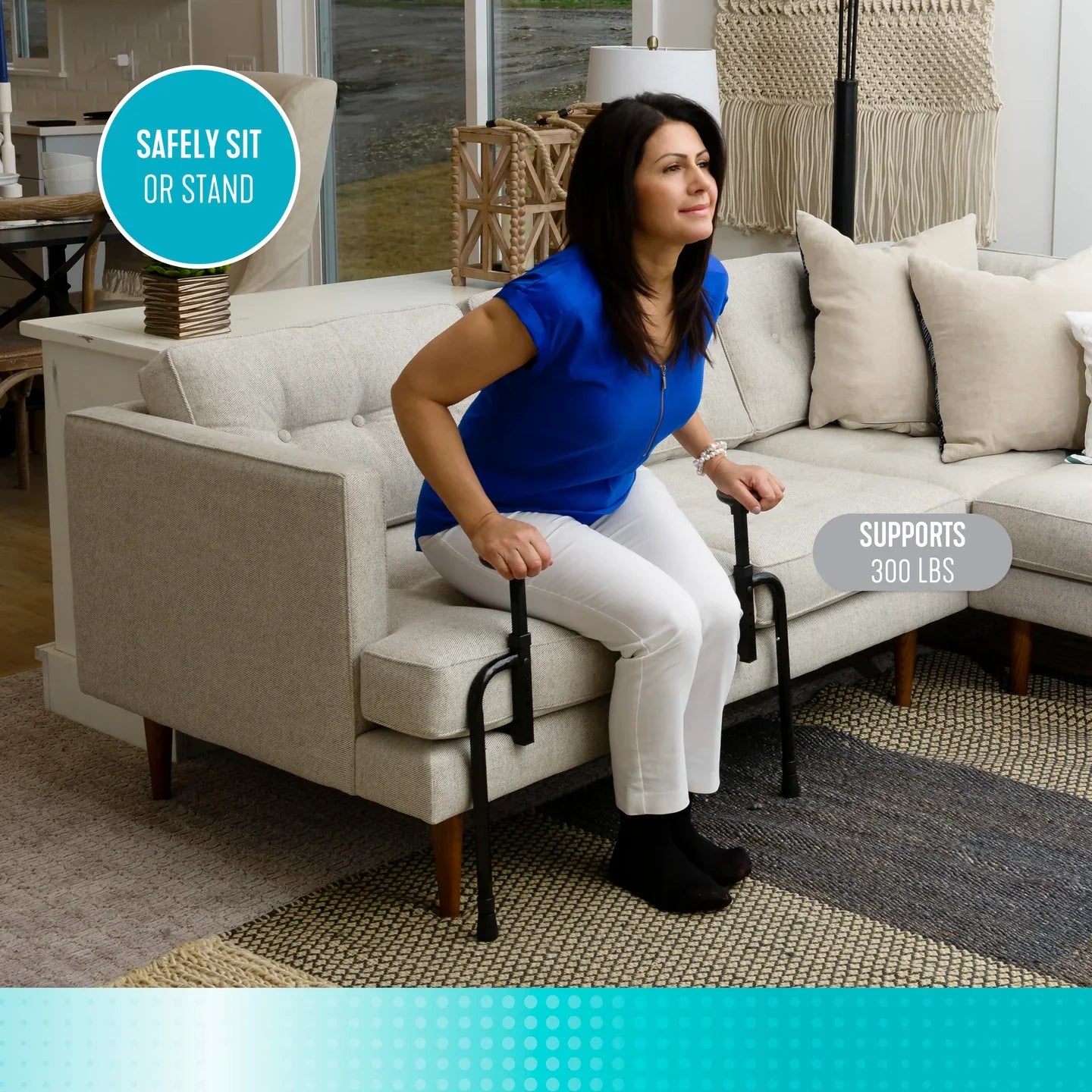 - Dual handles offer help to sit and stand safely